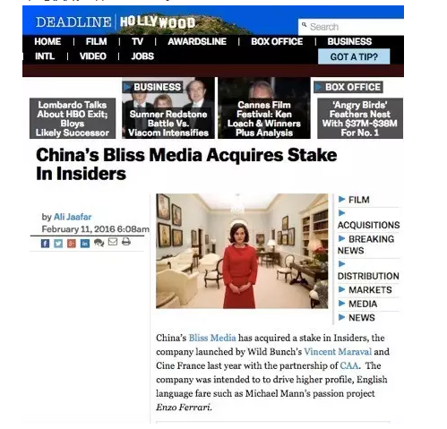 Deadline关于熙颐影业(Bliss Media)收购Insiders的报道